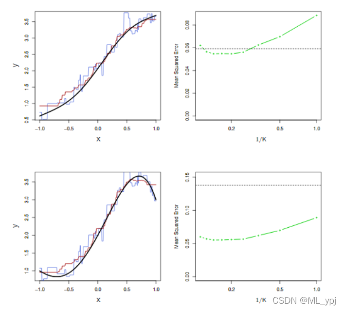 图11 左上角:在X和Y(黑色实线)之间有轻微非线性关系的设置中,显示K=1(蓝色)和K=9(红色)的KNN拟合。右上:对于轻微非线性的数据,最小二乘回归(水平黑色)的测试集MSE和1/K各种值(绿色)的KNN。左下角和右下角:与顶部面板相同,但两者之间存在强烈的非线性关系