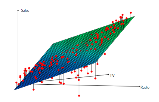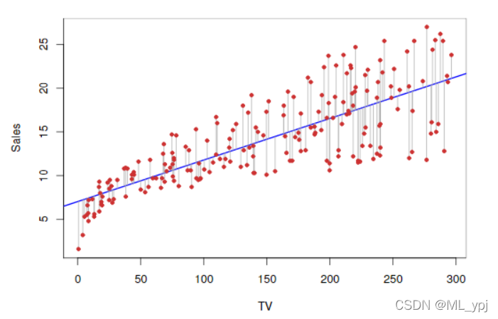 图3.1 广告数据集红点表示每个观测数据,蓝色的曲线是通过最小二乘法拟合得到的曲线。