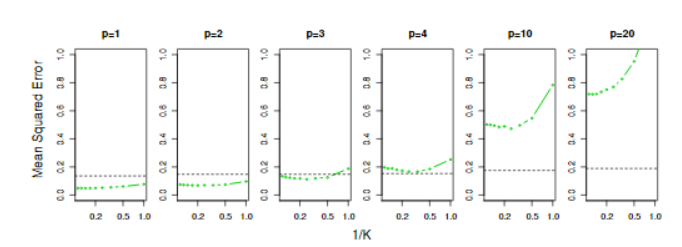 图3.12。不同纬度p下,线性回归(黑色虚线)和KNN(绿色曲线)的MSE。y和x真正的关系是第一个变量中是非线性的,如图3.11中的左下图所示,不依赖于其他变量。当存在这些额外的噪声变量时,线性回归的性能下降得很慢,而KNN的性能下降得更快。