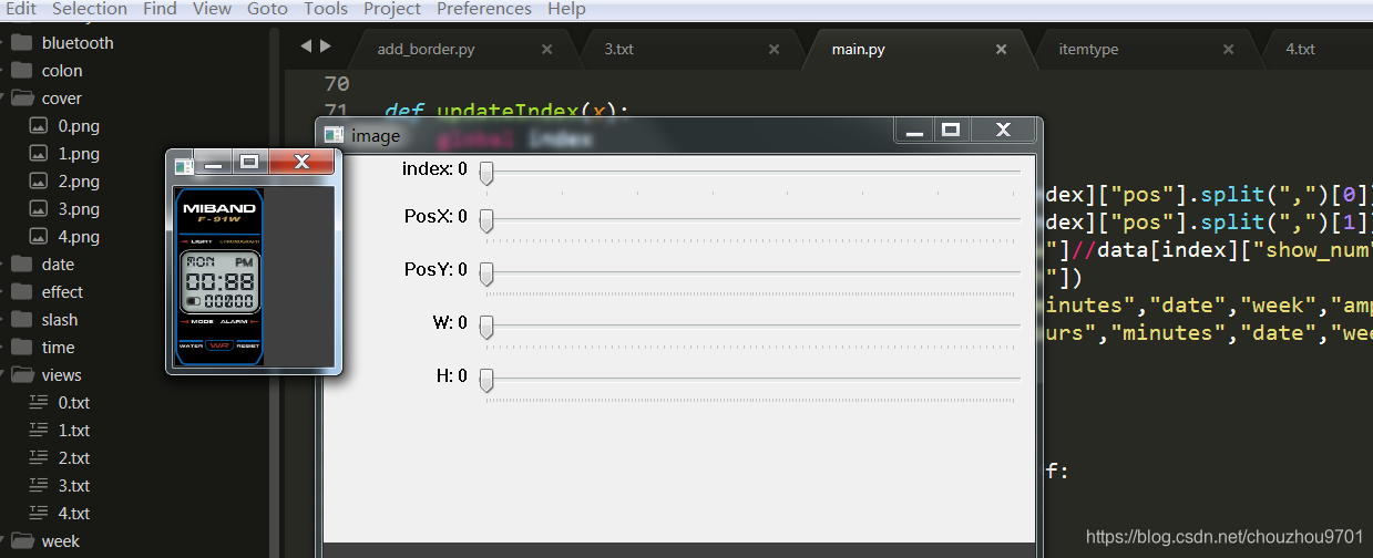 而PosX是和横向位置,PosY纵向位置,W是单个图片的宽度,注意这里我做了转换,否者按照配置文件的w是表示总的横向宽度,H是单个图片的高度,按q退出。这里每一次调节都会实时修改txt文件。但是不会改变真正的图片大小。如果需要修改图片大小可以使用我写的convert.py的脚本。修改实际图片大小也能有效的压缩表盘文件的大小。