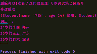 System.out.println("删除失败!违背了迭代器原理!可以试试集合倒着写");