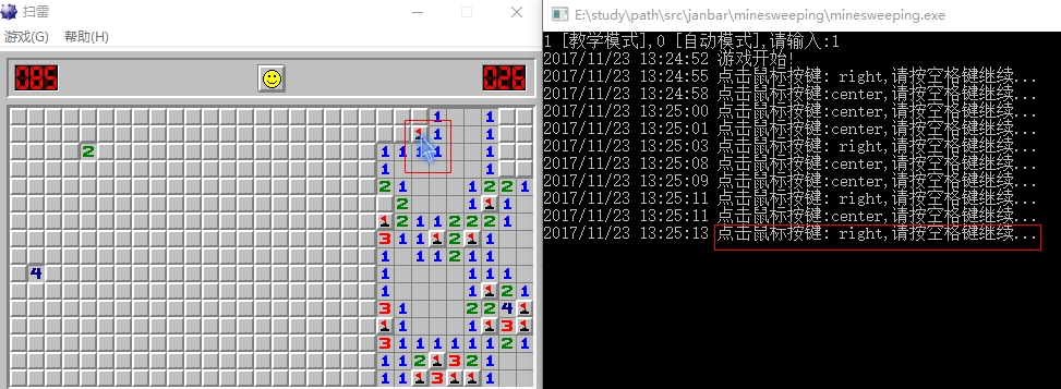 这里我要说一下,我的程序可以教你扫雷。如下图输入1或0回车即可