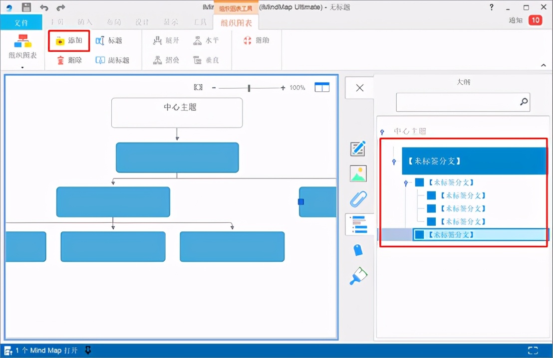 1.选中需要添加分支的主题,然后单击组织图表工具中的“添加”按钮,即可添加分支。