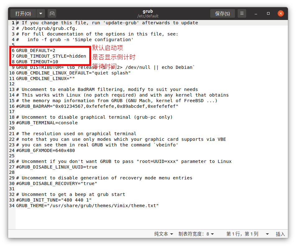 一般我们需要更改其中的 GRUB_DEFAULT(默认启动项:这个编号是你开机时看到的若干个启动项从上到下的依次编号,记住!编号是从0开始的,意思是,第一项是0,第二项是1,以此类推)、GRUB_TIMEOUT_STYLE(是否显示倒计时,hidden的属性表示不会显示倒计时)、GRUB_TIMEOUT(等待时间,单位是秒)