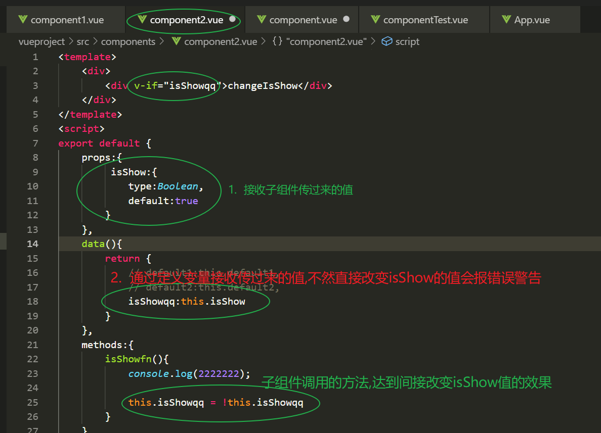 3. 孙组件通过变量接受子组件传过来的值, 改变 isShowqq 这个值就达到了修改isShow这个值得效果.
