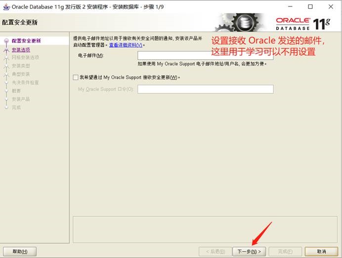 ORACLE服务端的安装及配置 l 将下载的安装包解压缩,双击[setup.exe]文件,系统检查监听参数,耐心等待,完成后出现如下界面,电子邮件可不填,"我希望..."建议不勾选 ...