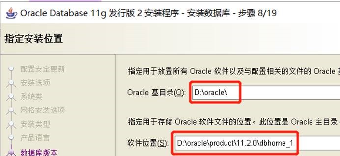 注意:我这里将默认的路径改为 D:\oracle 的路径了,这里根据个人喜好设置;但是在安装路径中不能包含中文和特殊字符!