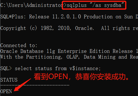 3) 检查数据库实例是否安装成功:select status from v$instance;