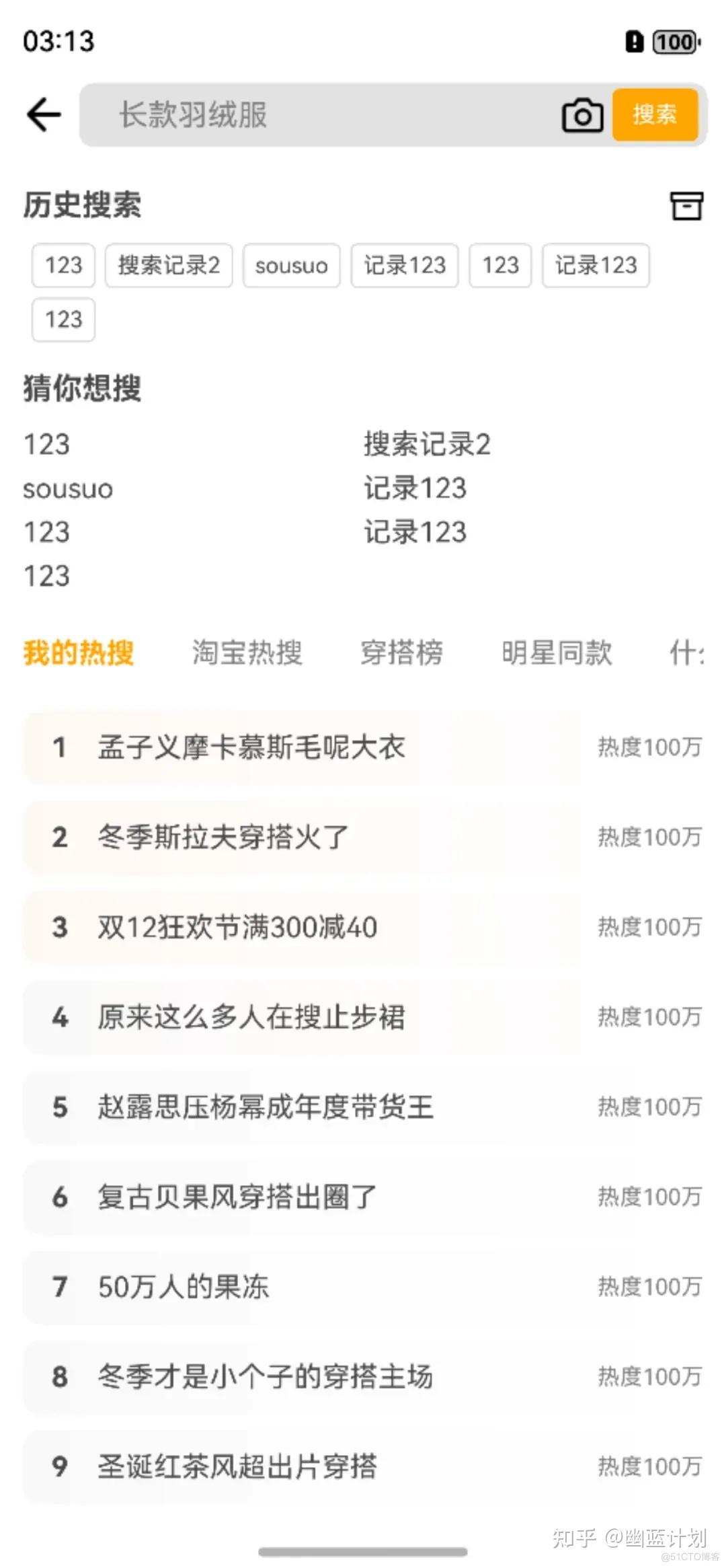 界面部分比较简单,大体分为导航栏、历史搜索、猜你想搜和热搜榜几个部分,历史搜索采用用户首选项进行存储数据。