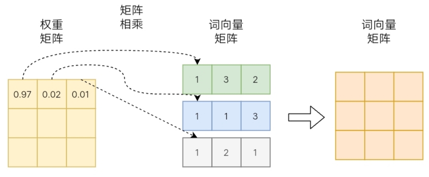 将得到的归一化的权重矩阵, 与词向量矩阵做"矩乘"。