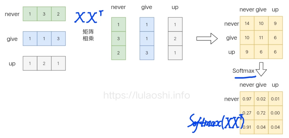 与我们刚才分析的 \(\large Softmax(XX ^⊤)\) 和 \(\large Softmax(XX ^⊤)X\) 有几分相似。