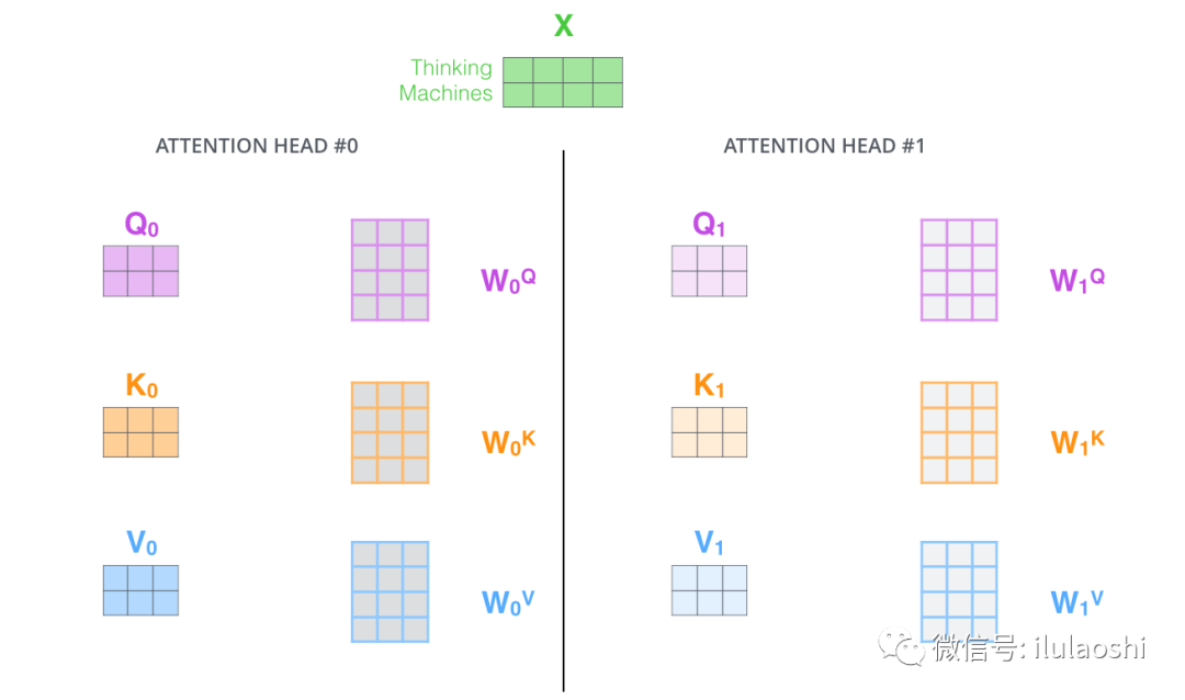 \(\large \bf{W_{Q0},\ W_{K0},\ W _{V0}}\) 与 \(\large \bf{W_{Q1},\ W_{K1},\ W _{V1}}\) ,