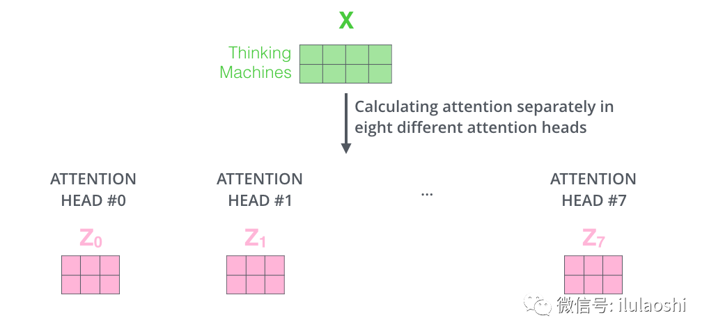 比如我们定义8组 \(\large \bf{W}\), 同一输入 \(\large \bf{X}\) , 将得到8个不同的输出: \(\large \bf{Z_0}\) 到 \(\large \bf{Z_0}\)
