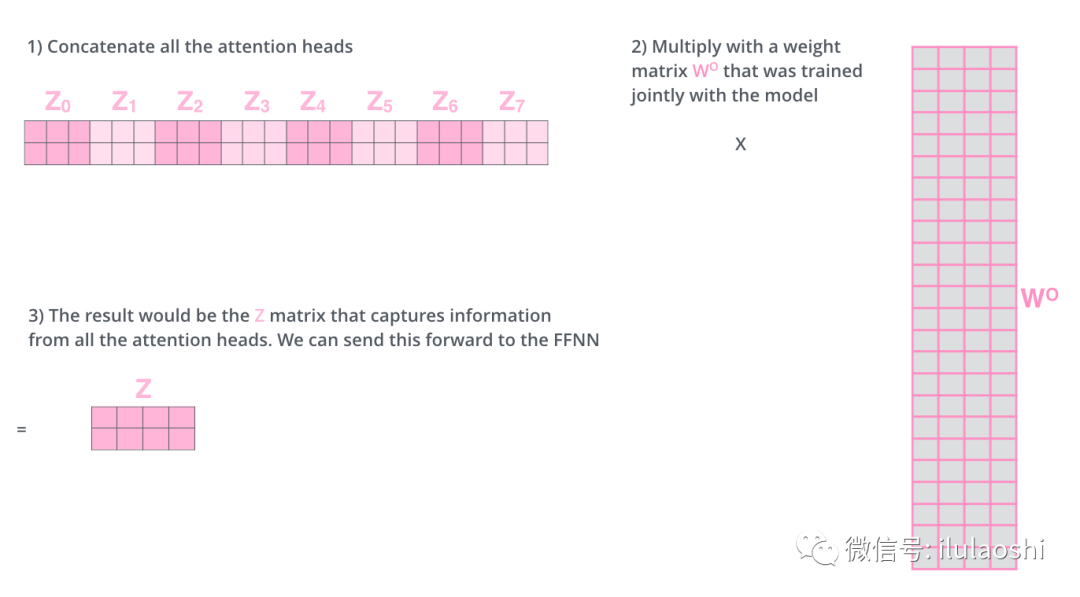 将多组输出拼接后乘以矩阵 \(\large \bf{W_O}\) 以降低维度