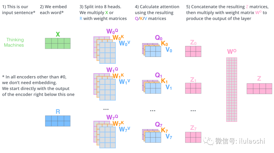 多头注意力的计算过程如下图所示。对于下图中的第2)步,
