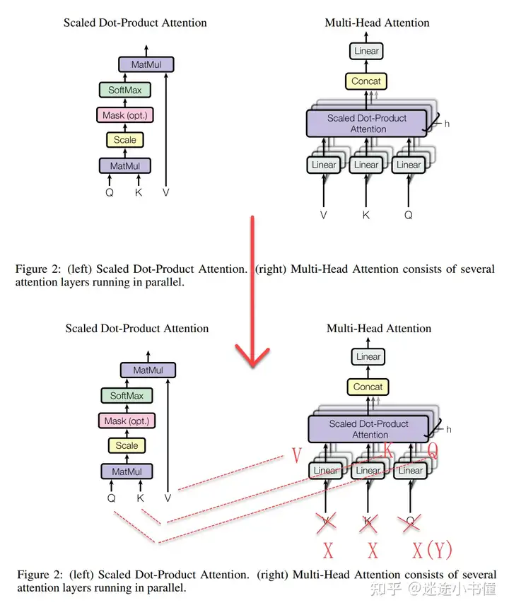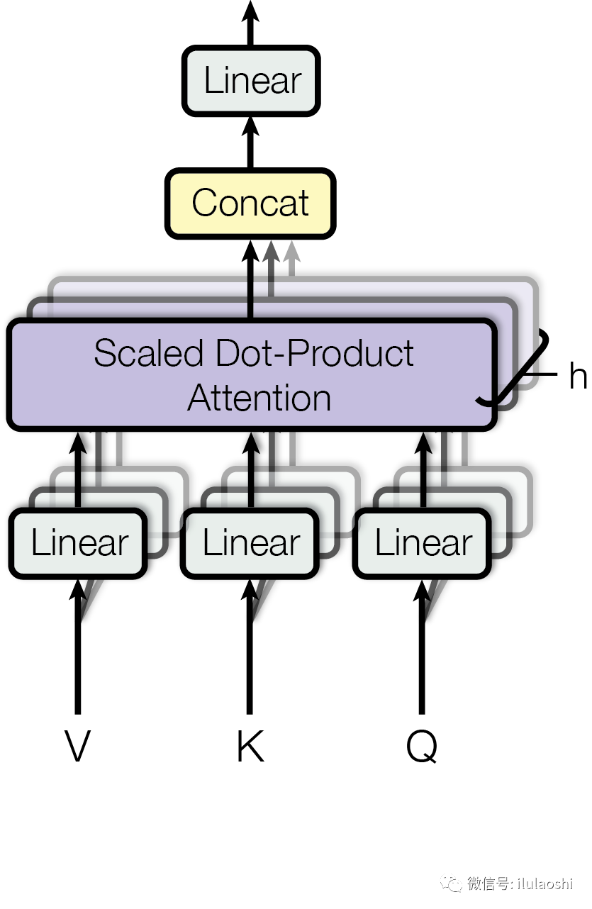 再去观察Transformer论文给出的多头注意力图示, 更容易理解: