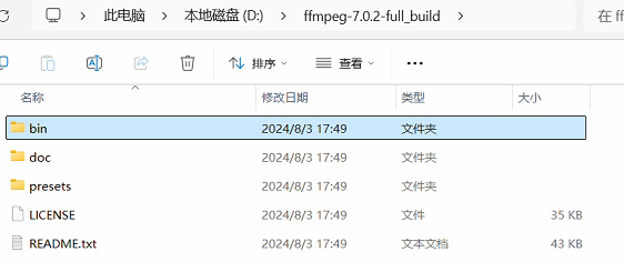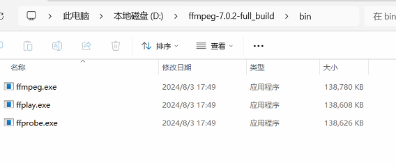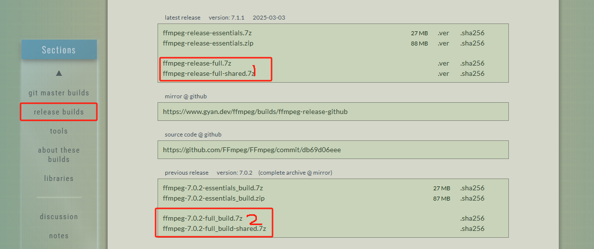 这边我们选择右边的1或者2都可,选择其一就可以然后shared和不带shared主要区别就是戴shared是把依赖包全部放在lib文件下面然后ffmpeg.exe,ffplay.exe,ffprobe.exe作为可执行文件就可以直接去lib里面调用相应功能,而不带shared的他的ffmpeg.exe,ffplay.exe,ffprobe.exe作为独立的执行的单独模块会在bin得目录下,每个文件就会大一些。这里我们以下载ffmpeg-7.0.2-full_build.7z为例