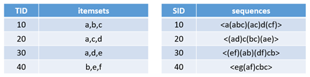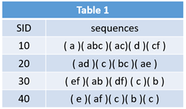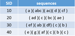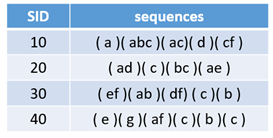 右边表格的每一条记录,是由多个项集组成的,并且组成序列的项集是有先后顺序的。
