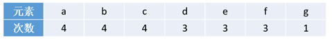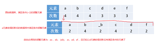 显然元素g出现的次数小于2,所以删除所有序列中的g元素。得到table 1表: