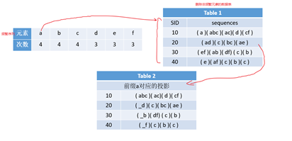 求前缀投影的方法是:对每条数据记录,从头开始扫描,如果不是前缀就删除这个元素,如果这个元素和前缀相同,也删除这个元素,此时对这一条记录停止扫描,并开始下一条数据记录的扫描。