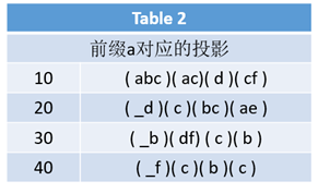 对这个新的数据库table1,依次以刚才的频繁元素为前缀,求其前缀投影,结果如下: