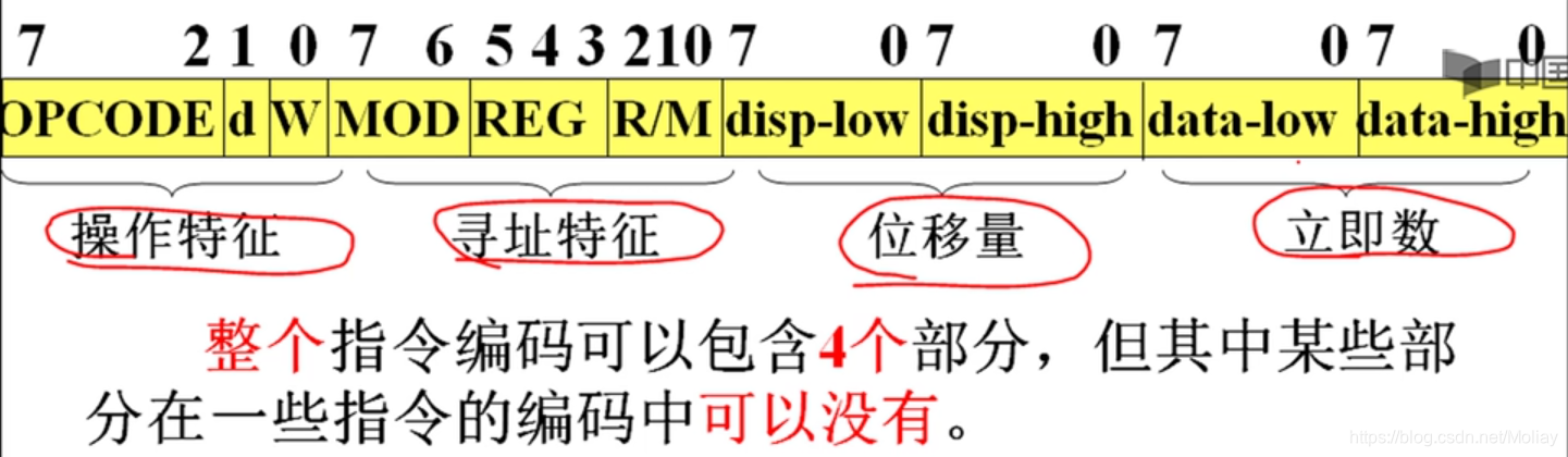 - 位移量:指令中直接给出的一个8位或16位数。一般源程序中以操作数名字(变量名或标号)的形式出现