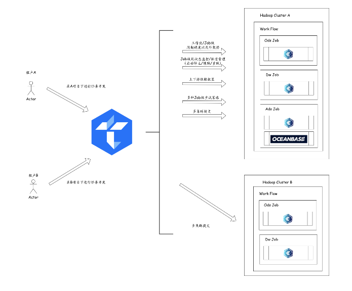另外,考虑多会有不同的角色在不同的集群进行开发,我们正好可以利用Taier多租户多集群资源隔离的特性,来实现不同用户在一套Taier集群上分别运行不同的任务在各自Hadoop集群上。
