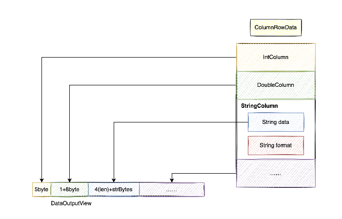 在经过我们多次对ChunJun性能的测试以及火焰图的分析之后,我们发现数据的序列化/以及反序列化是对读写性能损耗最大的一块,通过对Kryo序列化的研究,我们实现了自己的序列化格式:ColumnRowData。