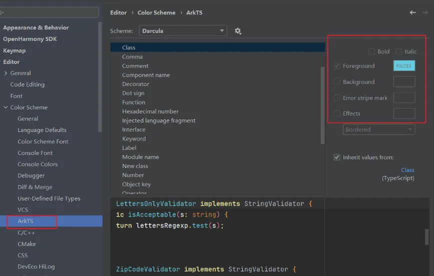 DevEco Studio 支持对关键字、运算符、字符串、类名、注释等语法元素进行高亮显示。用户可通过 File > Settings(macOS 为 DevEco Studio > Preferences)进入Editor > Color Scheme自定义颜色方案。可在Language Defaults设置全局颜色方案,或为特定语言单独配置颜色(取消“Inherit values from”后进行设置)。