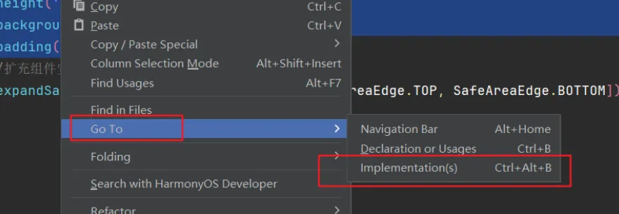 支持在 .d.ts 等声明文件中跳转至 C/C++ 函数的定义,实现 ArkTS/JS 与 Native 混合开发时的跨语言导航。您可以选中接口名称单击右键,在弹出的菜单中选择Go To > Implementation(s)实现跨语言跳转。