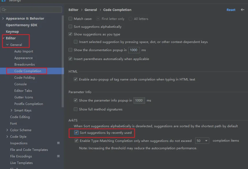 自动补齐功能默认按最短路径进行排序,如仅需按照最近使用过的类、方法、字段和关键字等名称提供补全内容排序,可以在File > Settings (MacOS为DevEco Studio > Preferences)> Editor > General > Code Completion 中勾选“Sort suggestions by recently used”。