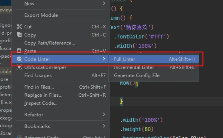 DevEco Studio 集成多种 Linter 工具,用于统一代码风格与保障质量。编辑器中右键点击 > Code Linter,或在项目文件/目录上右键 > Code Linter > Full Linter。
