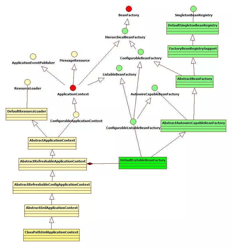 该图为 ClassPathXmlApplicationContext 的类继承体系结构,虽然只有一部分,但是它基本上包含了 IOC 体系中大部分的核心类和接口。