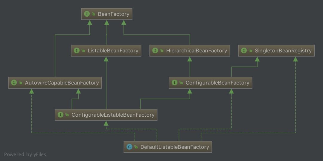 BeanFacoty 有三个直接子类 ListableBeanFactory、 HierarchicalBeanFactory 和 AutowireCapableBeanFactory, DefaultListableBeanFactory 为最终默认实现,它实现了所有接口。