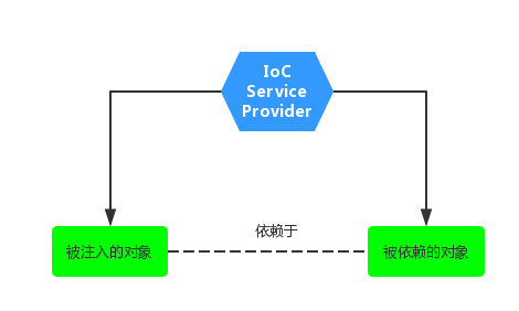 在没有引入 IoC 的时候,被注入的对象直接依赖于被依赖的对象,有了 IoC 后,两者及其他们的关系都是通过 Ioc Service Provider 来统一管理维护的。被注入的对象需要什么,直接跟 IoC Service Provider 打声招呼,后者就会把相应的被依赖对象注入到被注入的对象中,从而达到 IOC Service Provider 为被注入对象服务的目的。所以 IoC 就是这么简单!原来是需要什么东西自己去拿,现在是需要什么东西让别人(IOC Service Provider)送过来