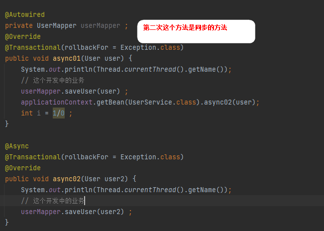 结果:第一个方法数据回滚了,第二个异步的数据保存成功了。