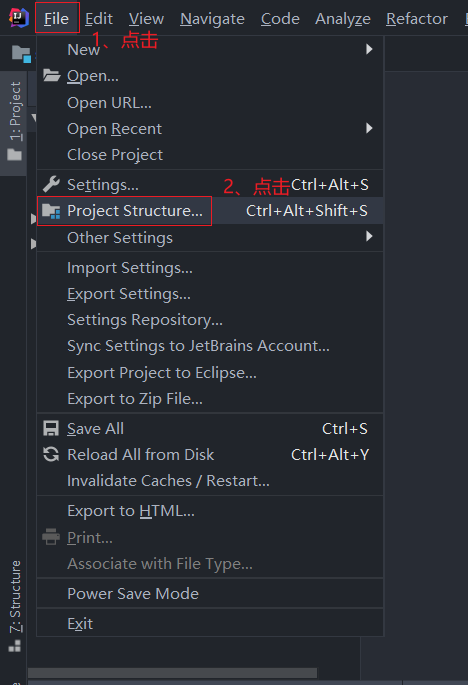 (1) 打开Idea,点击File,然后点击Project Structure…,进入项目结构