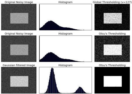 下面的例子中,输入图像是一副带有噪声的图像。第一种方法,我们设127 为全局阈值。第二种方法,我们直接使用 Otsu 二值化。第三种方法,我们首先使用一个 5x5 的高斯核除去噪音,然后再使用 Otsu 二值化。看看噪音去除对结果的影响有多大吧。