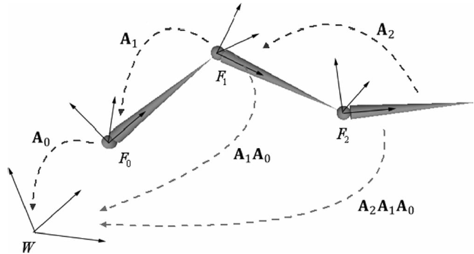 如果矩阵A0是第一根骨骼的世界变换矩阵,A1是第二根骨骼变换到第一根骨骼的矩阵,往后依次类推,那么第i根骨骼变换到世界坐标系的变换矩阵就是: