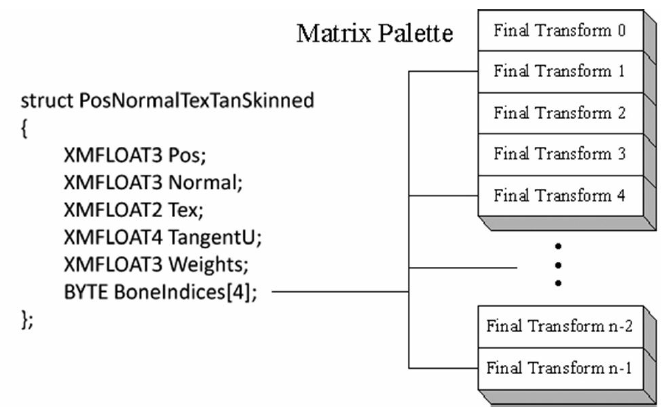 - 为了实现顶点混合,我们将每个骨骼的最终变换矩阵保存在一个列表中,最后放到常量缓冲中;然后对于顶点,保存矩阵索引列表和权重列表即可进行计算。