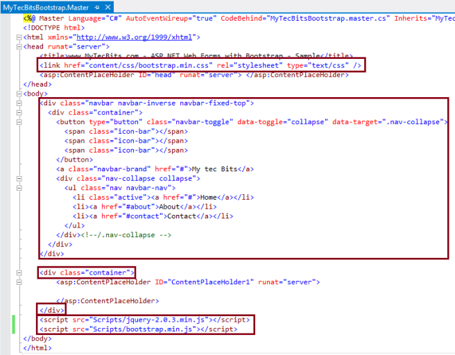 The location of the source code for the sample solution created with the above steps is available in the continuation article� Bootstrap 3.0.0 with ASP.NET Web Forms – Step by Step – Sample Code. Get The Sample Code –>