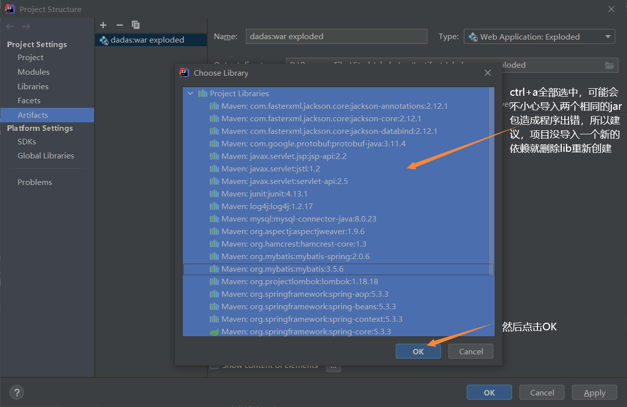 注意每添加一个jar包将之前的原有lib目录删掉然后重新导包(ctrl+a)