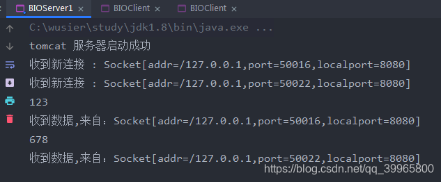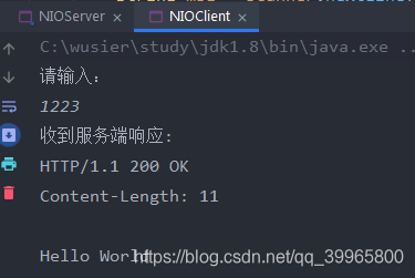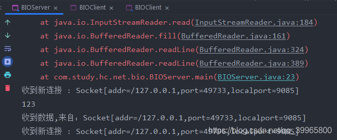 当开启多个client的时候,则不能继续执行会卡在reader.readline()里面,因此是阻塞IO,直到第一个client发送完数据