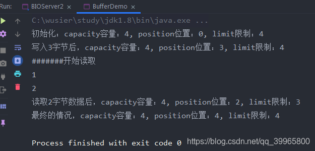 System.out.println(String.format("读取2字节数据后,capacity容量:%s, position位置:%s, limit限制:%s", byteBuffer.capacity(),