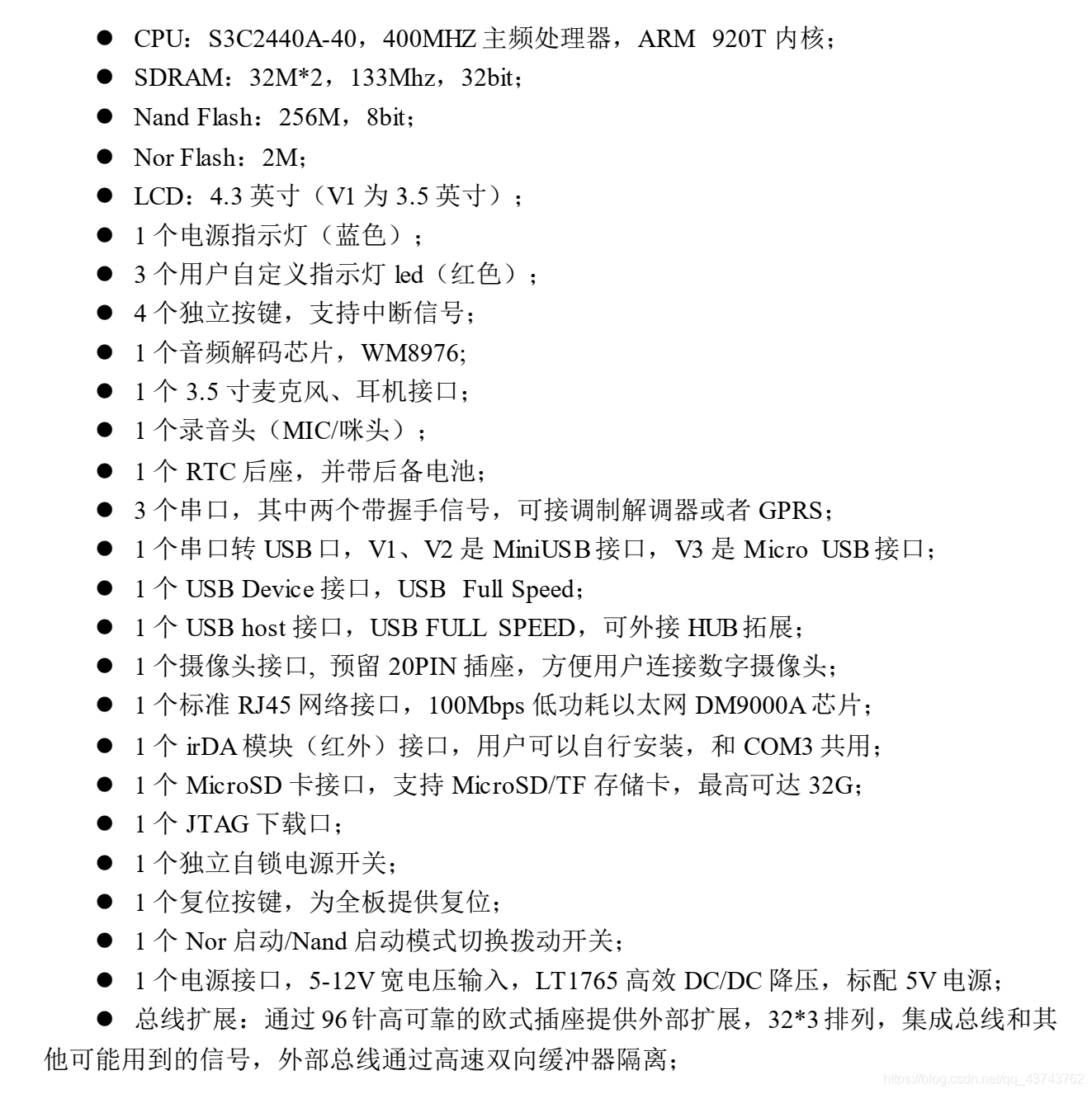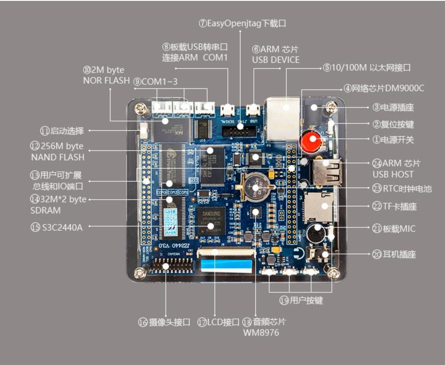 开发板使用了三星的JZ2440V3(基于S3C2440改进的版本),网上有丰富的资源,有助于学习,板载资源如图所示: