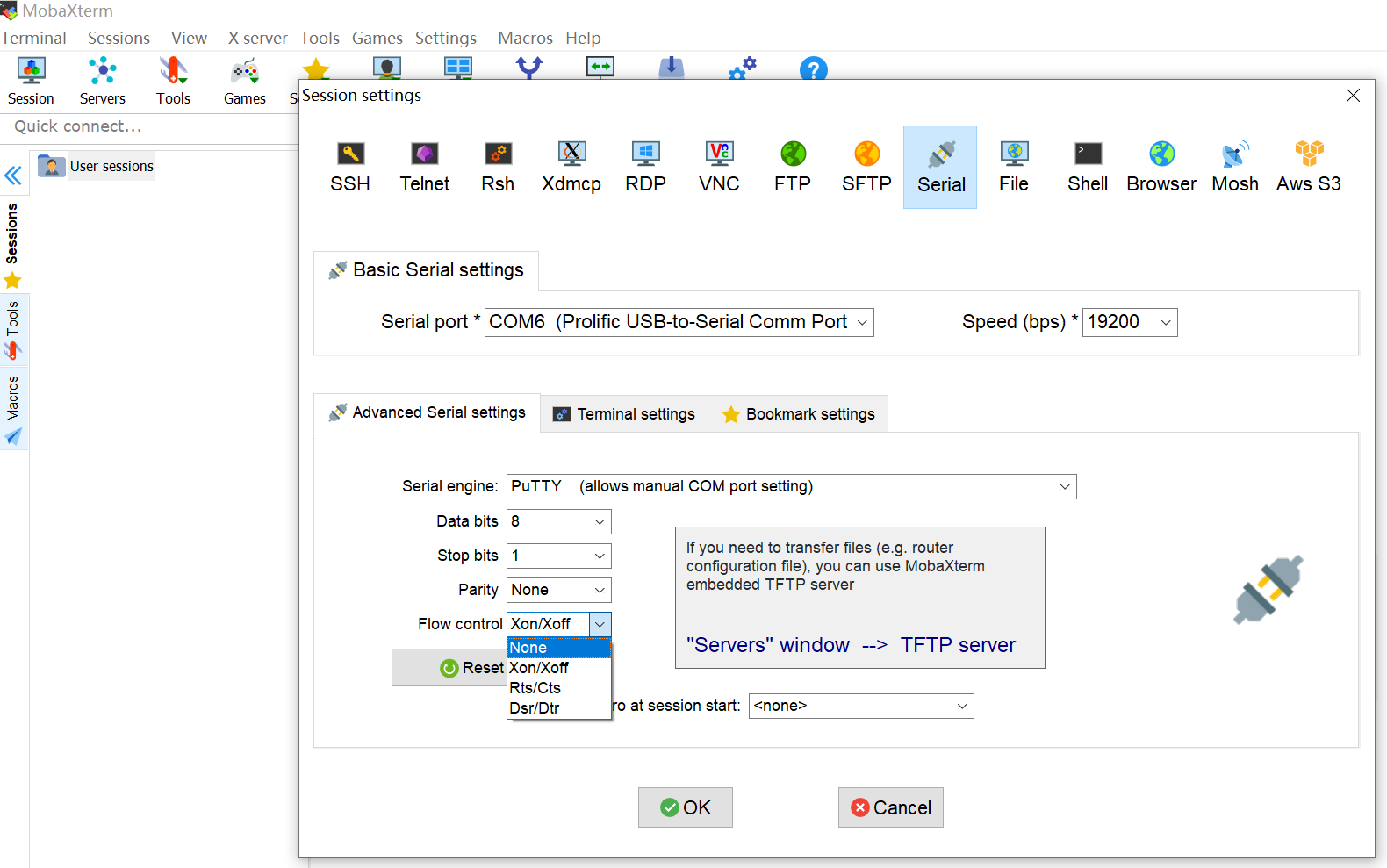 (注意:选择对应的USB串口,bps:115200 ,Flow control:None)
