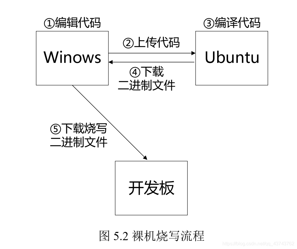 在STM32的开发中,只需要cpoy一个工程模板,然后在MDK中编写驱动,点击编译和烧录就可以将程序烧写进开发板,MDK对用户没有开放编译和烧录的细节,而在Linux嵌入式的开发中,我们需要亲自操作每一步来烧录,下面简单了解一下程序烧录的大概流程: