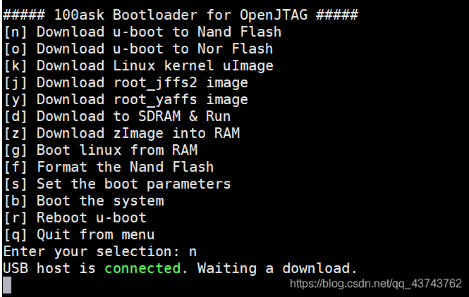 - 然后通过u-boot使用USB-Device烧录内核和文件系统,烧录在Nand FLASH中