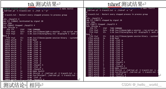 针对tsh和参考shell程序tshref,完成测试项目4.1-4.15的对比测试,并将测试结果截图或者通过重定向保存到文本文件(例如:./sdriver.pl -t trace01.txt -s ./tsh -a "-p" > tshresult01.txt),并填写完成4.3节的相应表格。