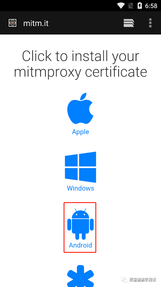 8、代理设置好后就可以开始抓包了么?不还差一步。我们需要打开浏览器在地址栏中输入mitm.it,选择安卓-下载证书。